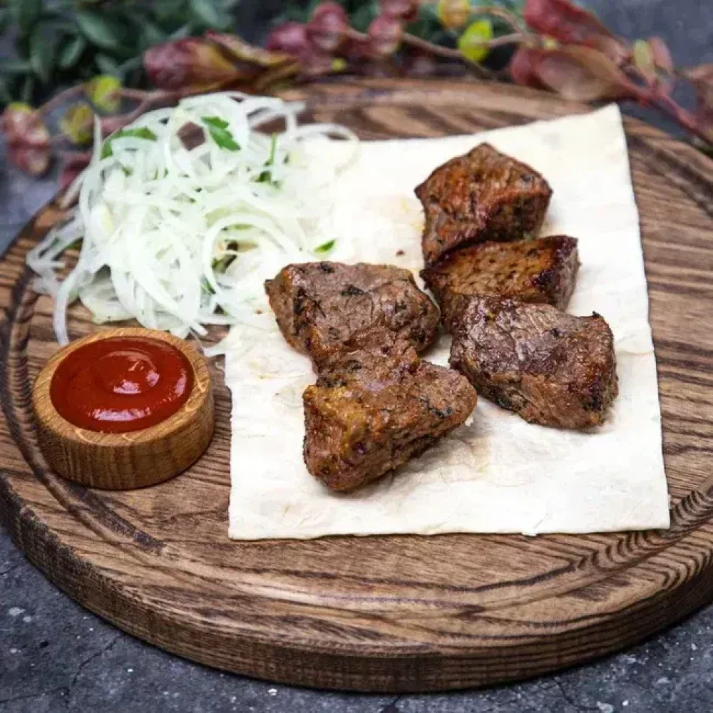 Телятина мякоть, лаваш, лук, красный соус (200гр)без учёта прожарки