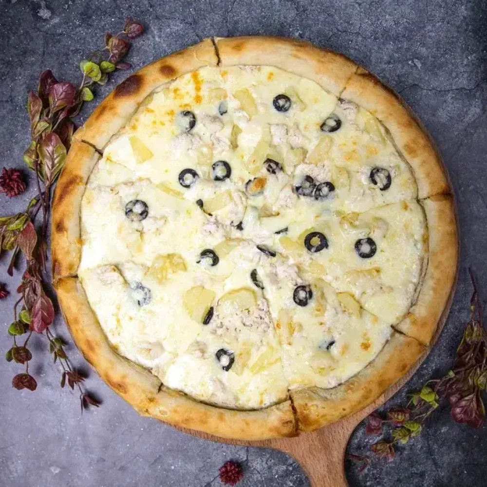 Куриная грудка, ананас, маслины, сливки, моцарелла, пармезан, тесто (32см)