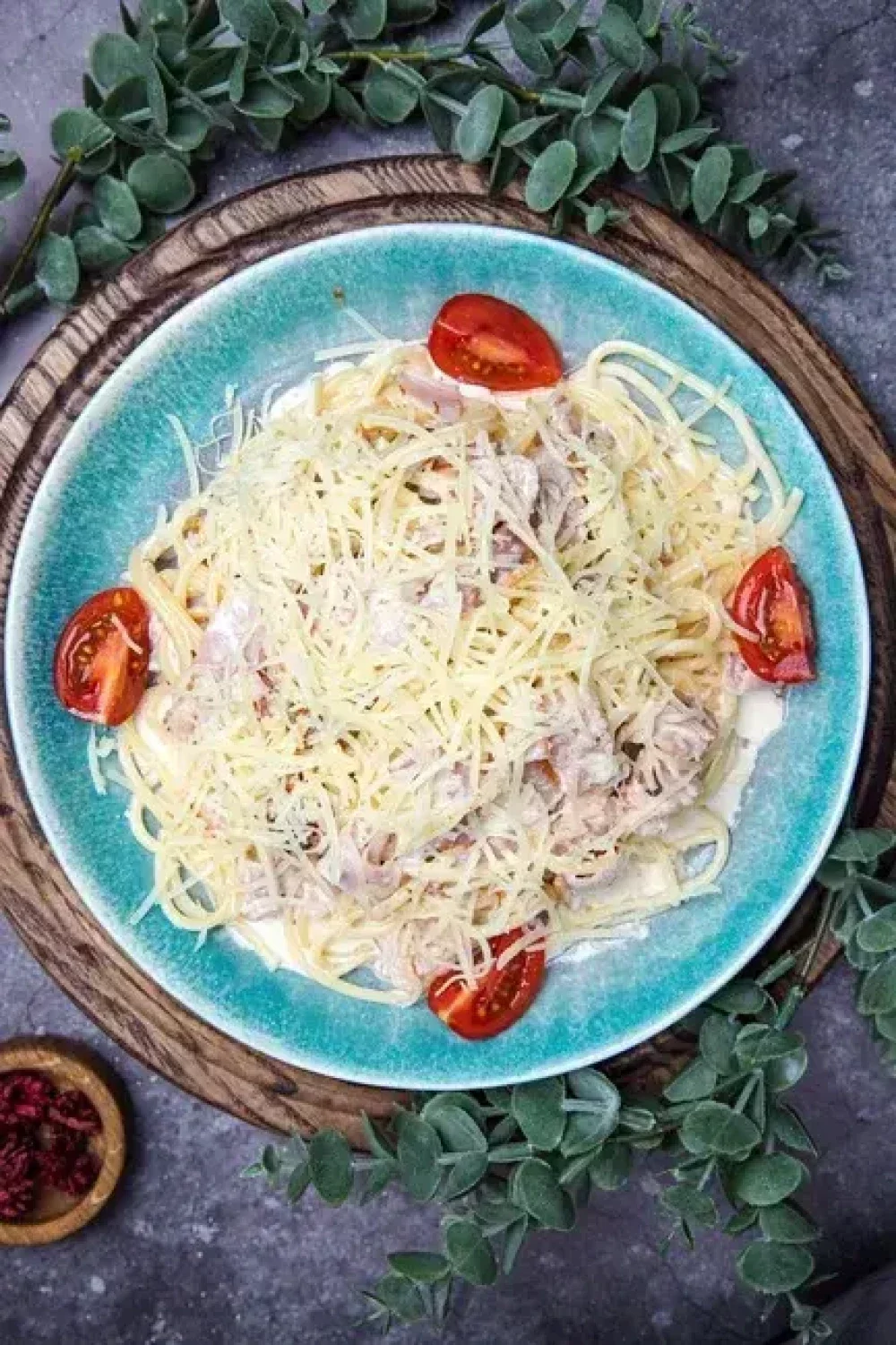 Спагетти, бекон, вино белое, сливки, сыр пармезан, томаты черри (400 гр)