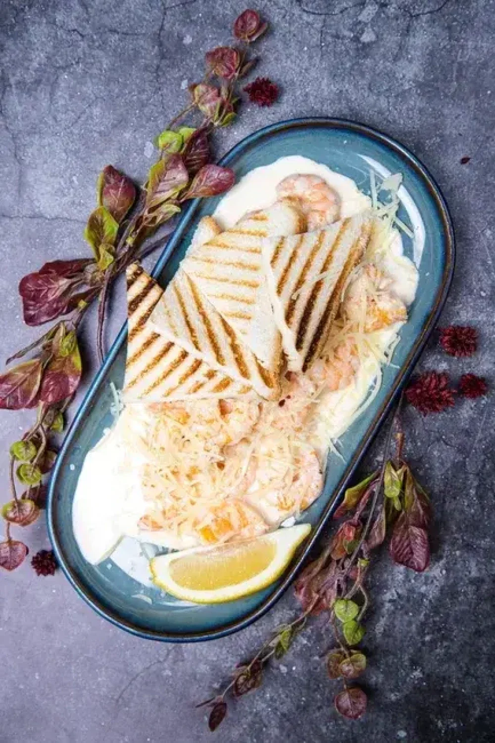 Креветки, сливки, белое вино, чеснок, лимон, хлеб тостовый, сыр пармезан (300 гр)