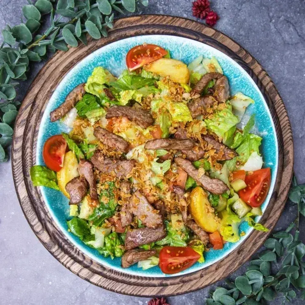 Телятина, помидор, маринованный огурец, картофель, горчичный соус, салат романо, томаты черри, лук фри (300гр)