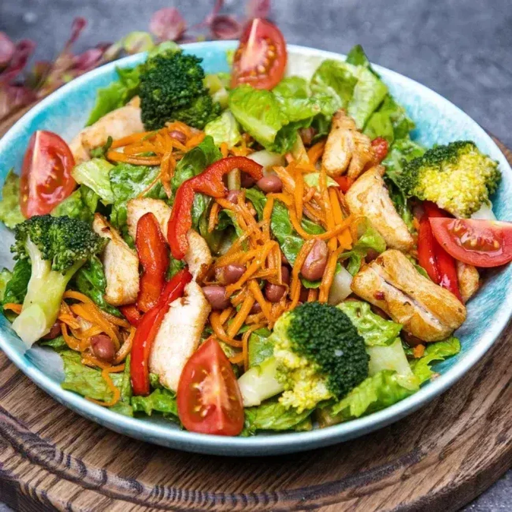 Куриная грудка, болгарский перец, брокколи, красная фасоль, морковь по-корейски, салат романо, соевый соус, томаты черри (300гр)