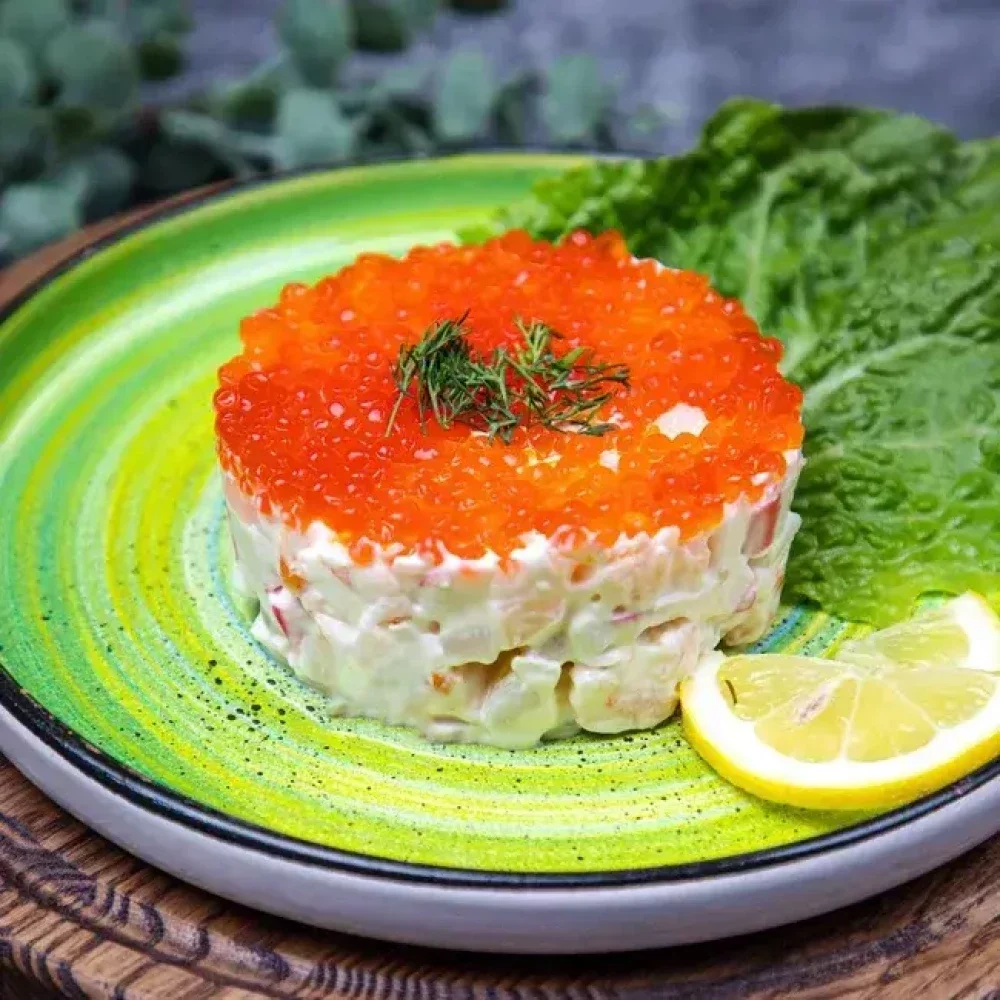 Кальмар, креветки, крабовые палочки, икра красная, майонез, лимон (250гр)
