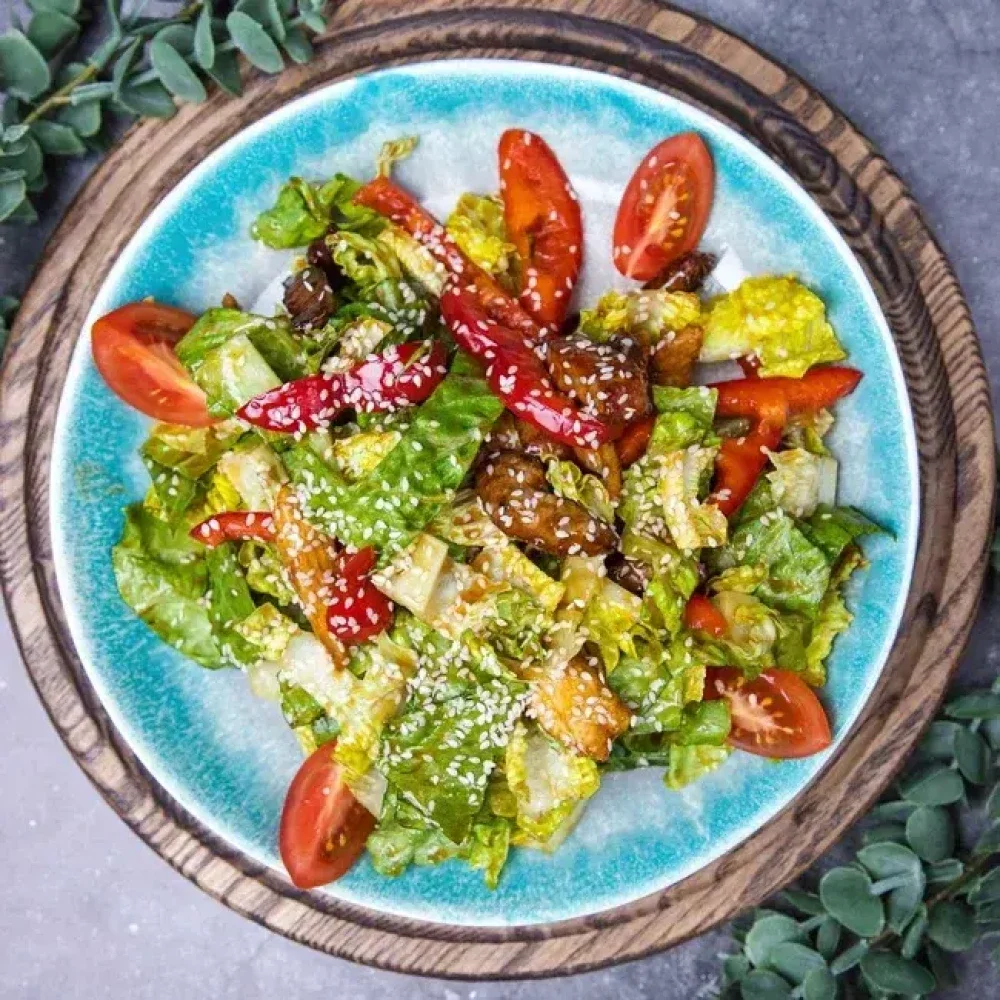 Куриная грудка,телятина, болгарский перец, салат романо, томаты черри, соус терияки, кунжут (300гр)