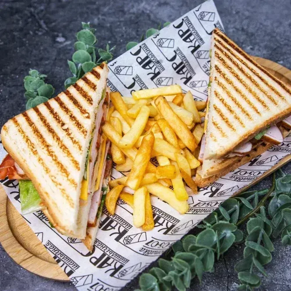 Хлеб тостовый, куриная грудка, помидор, салат романо, белый соус, красный соус, сыр чеддер, картофель фри (400гр)