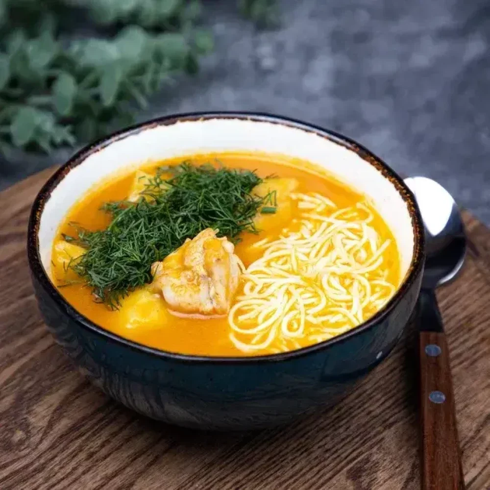 Лук, болгарский перец, картофель, лапша, мясо куриное, зелень, лепёшка (400мл)