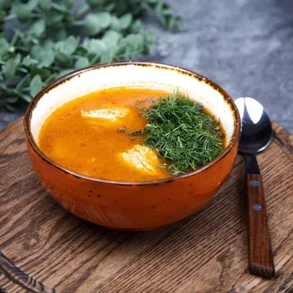 Куриная грудка, рис, картофель, аджика, помидоры, томатная паста, зелень, лепёшка (400мл)