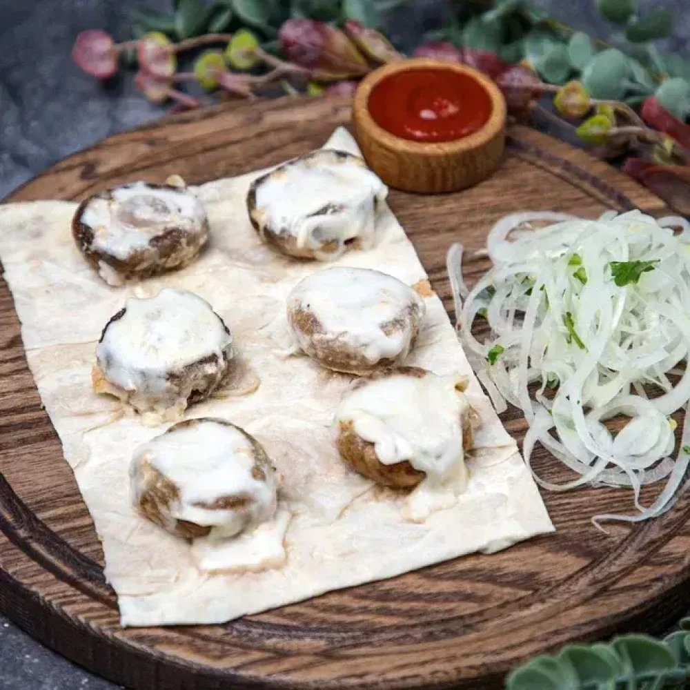 Грибы, сыр "Моцарелла", лаваш, красный соус,лук (220гр)без учёта прожарки
