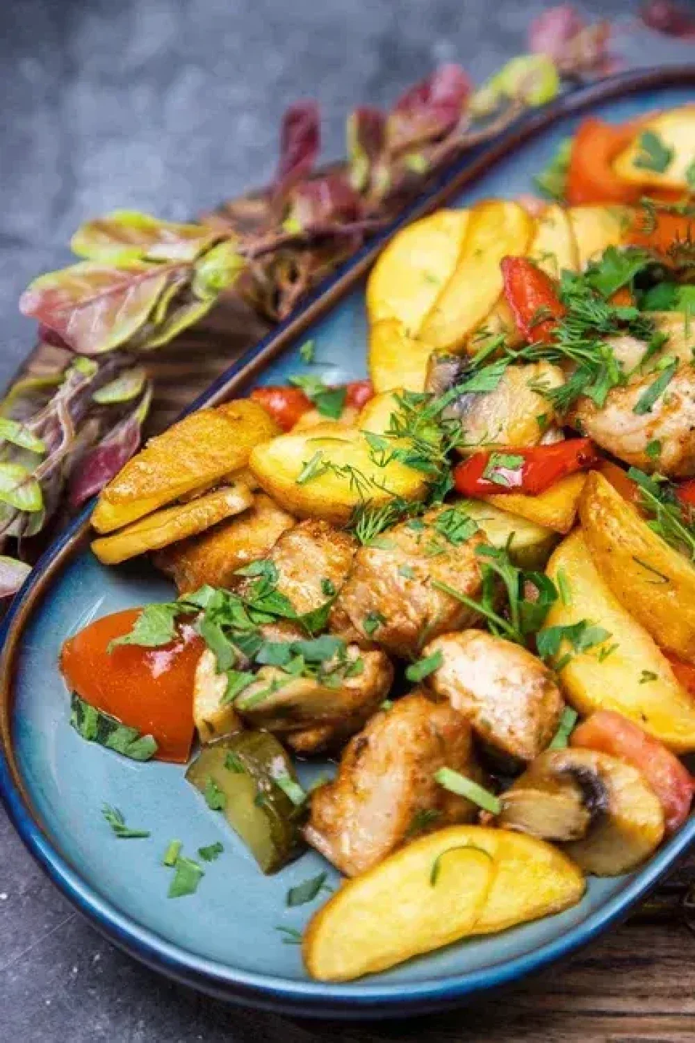 Свинина мякоть, картофель по-деревенски, помидор, маринованный огурец, болгарский перец, лук, грибы шампиньоны, зелень (350 гр)