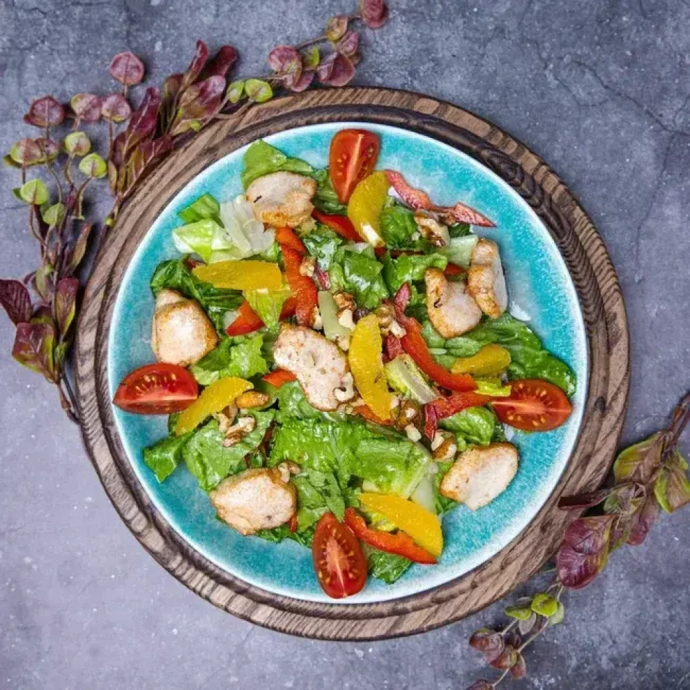 Куриная грудка, болгарский перец, грецкий орех ,салат романо, мёд, апельсин,томаты черри (300гр)