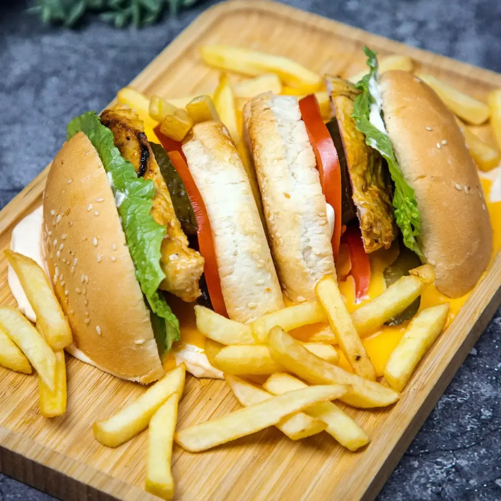 Булочка,куриная котлета,помидоры,салат романо,пармезан,соус цезарь,соус сырный. Подаётся с картофелем фри