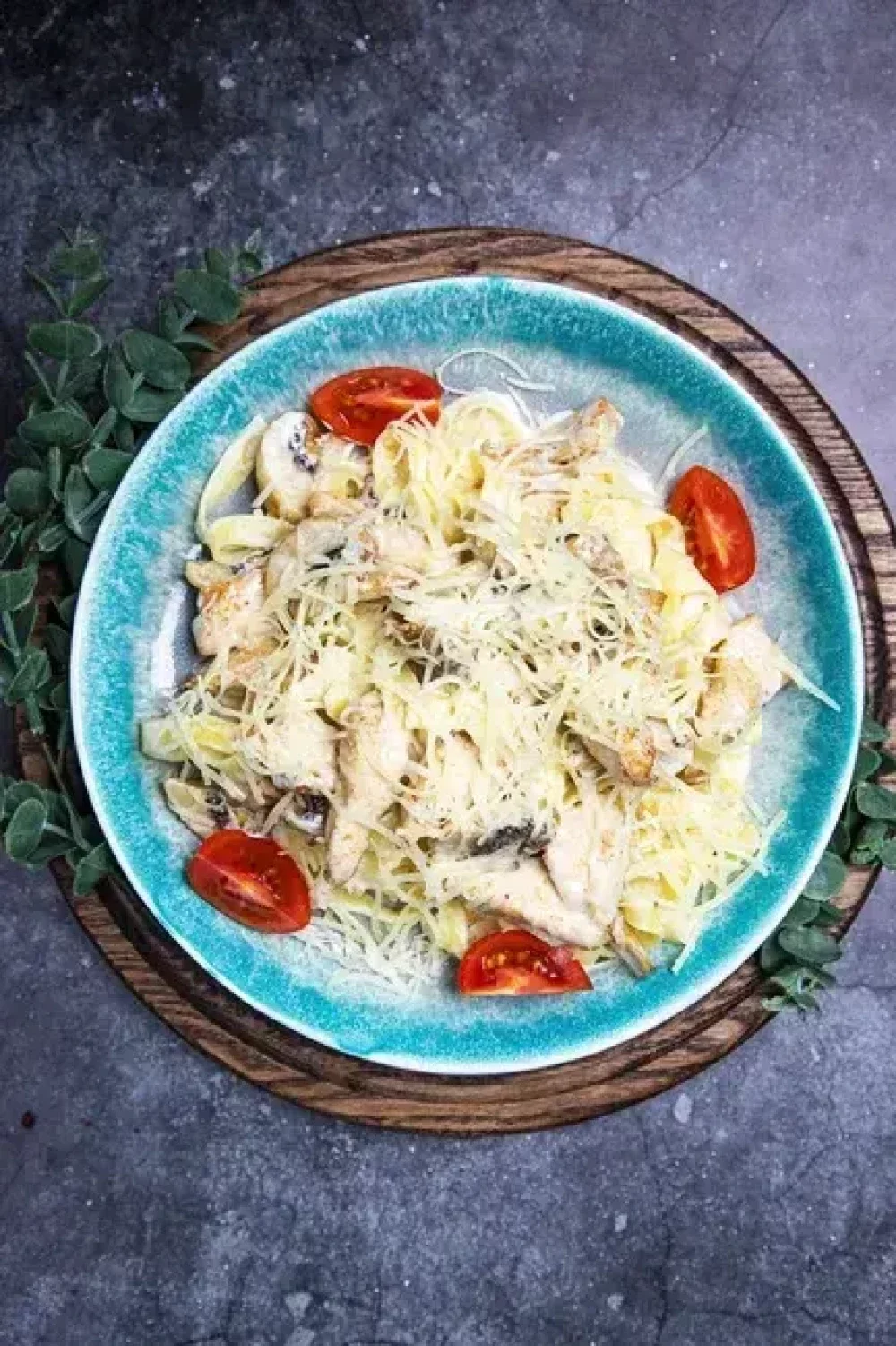 Паста фетучини, куриная грудка, грибы шампиньоны, сливки, сыр пармезан, томаты черри (400 гр)