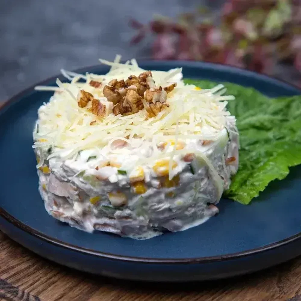 Куриная грудка, ветчина, огурец свежий, кукуруза, сыр пармезан, грецкий орех, майонез (250гр)